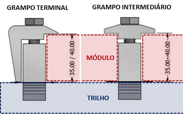 Já o grampo intermediário, entre dois módulos costuma atender a várias espessuras de módulo. Neste caso, o parafuso força os módulos contra o trilho, mas o próprio grampo não encosta nele.
