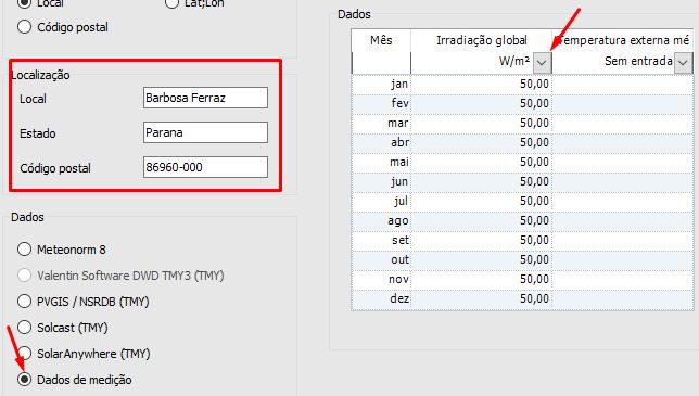 - Selecione a unidade correta dos dados que você vai informar. No caso do Cresesb, seria "kWh/m² dia";