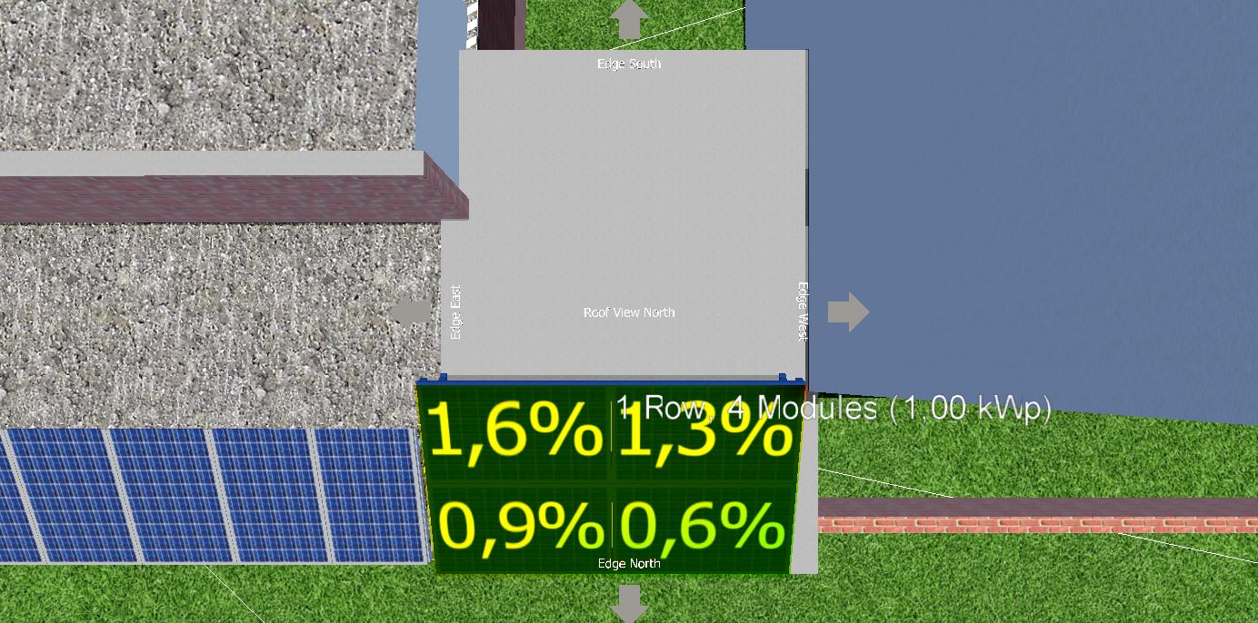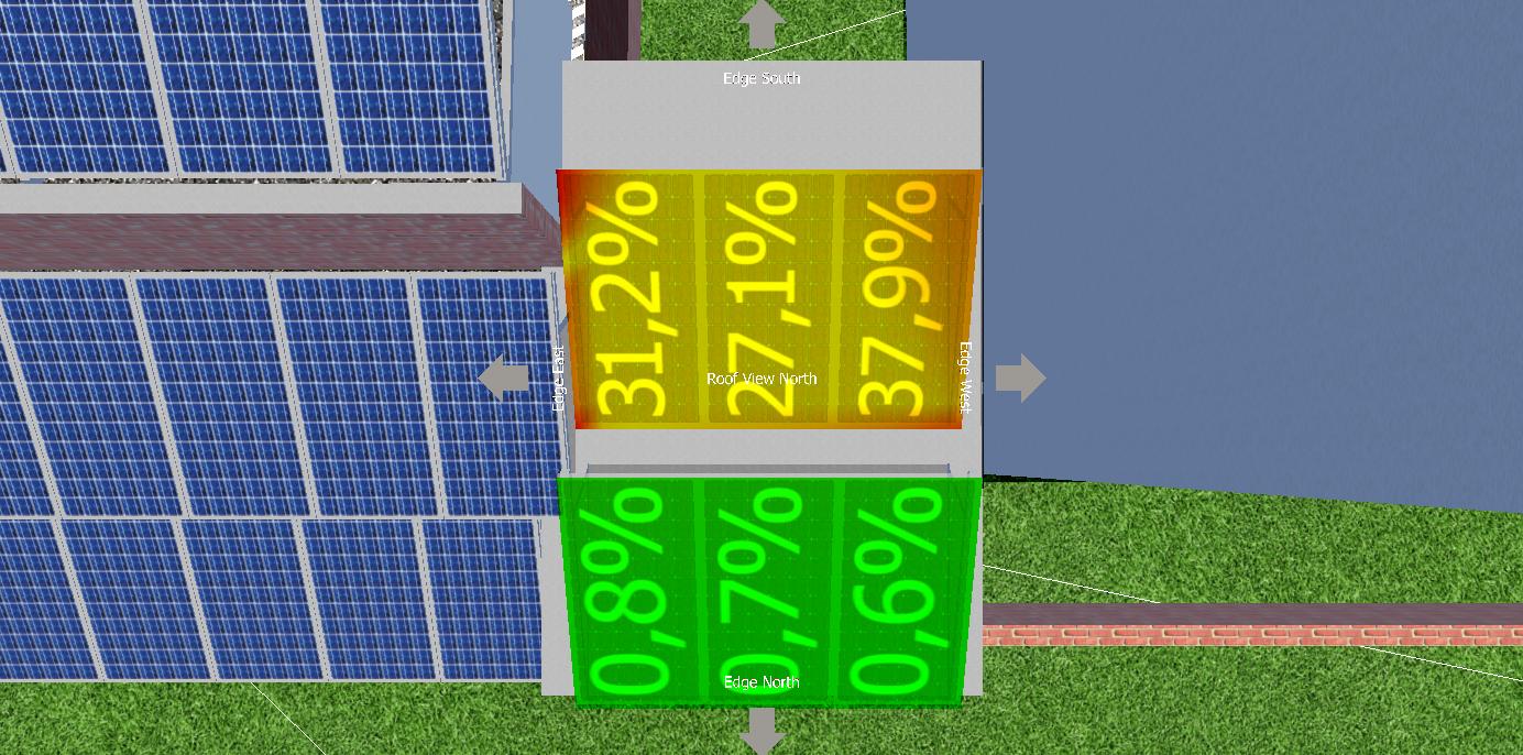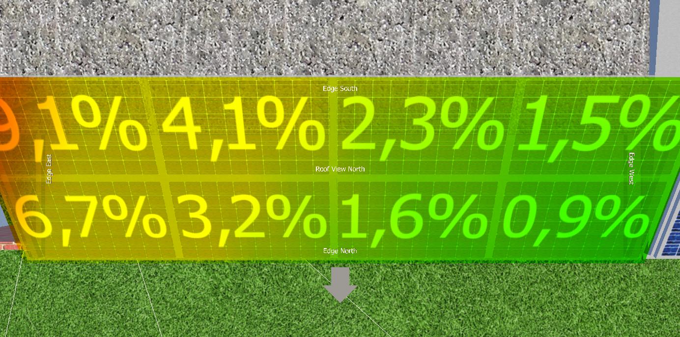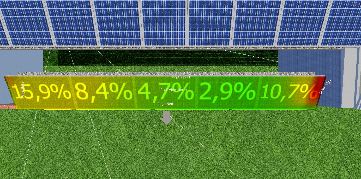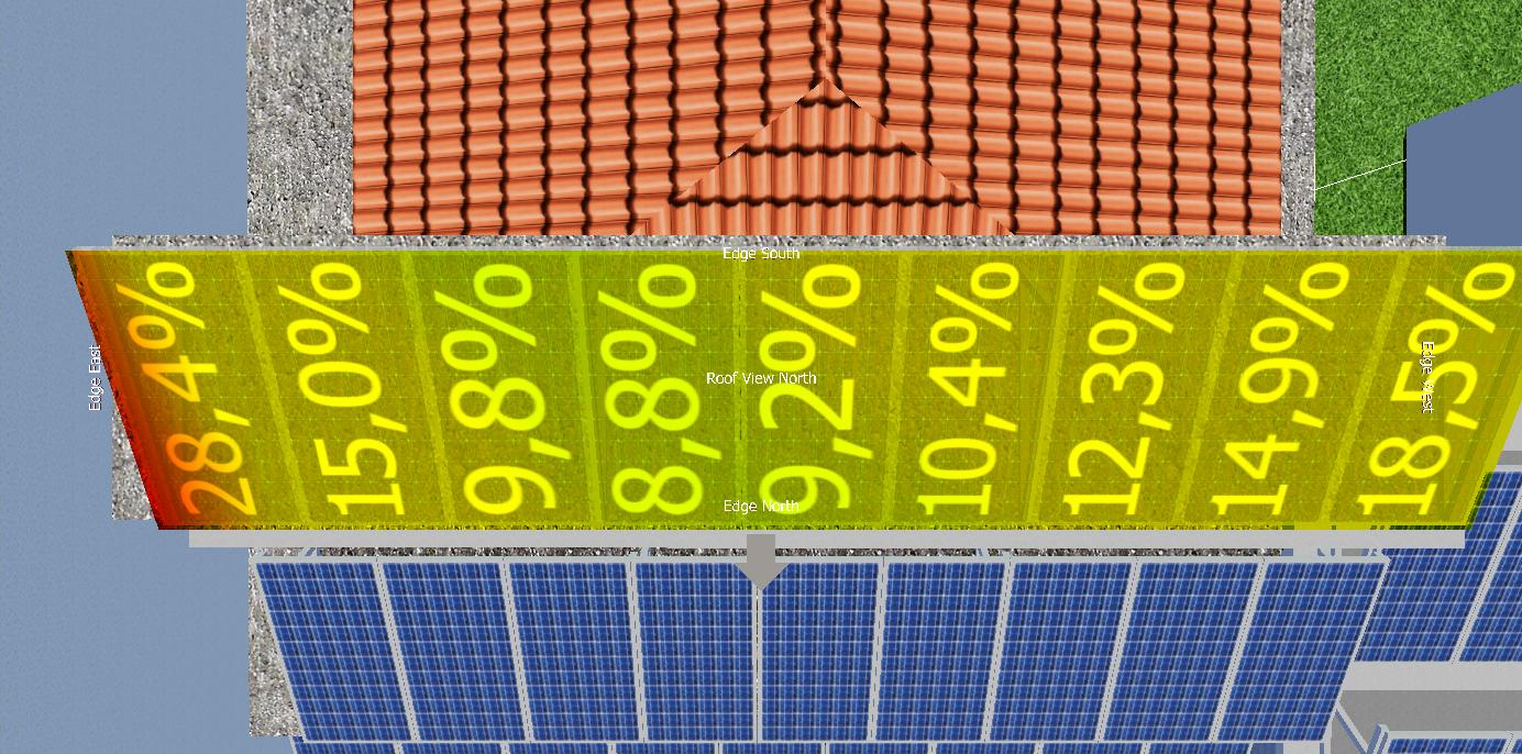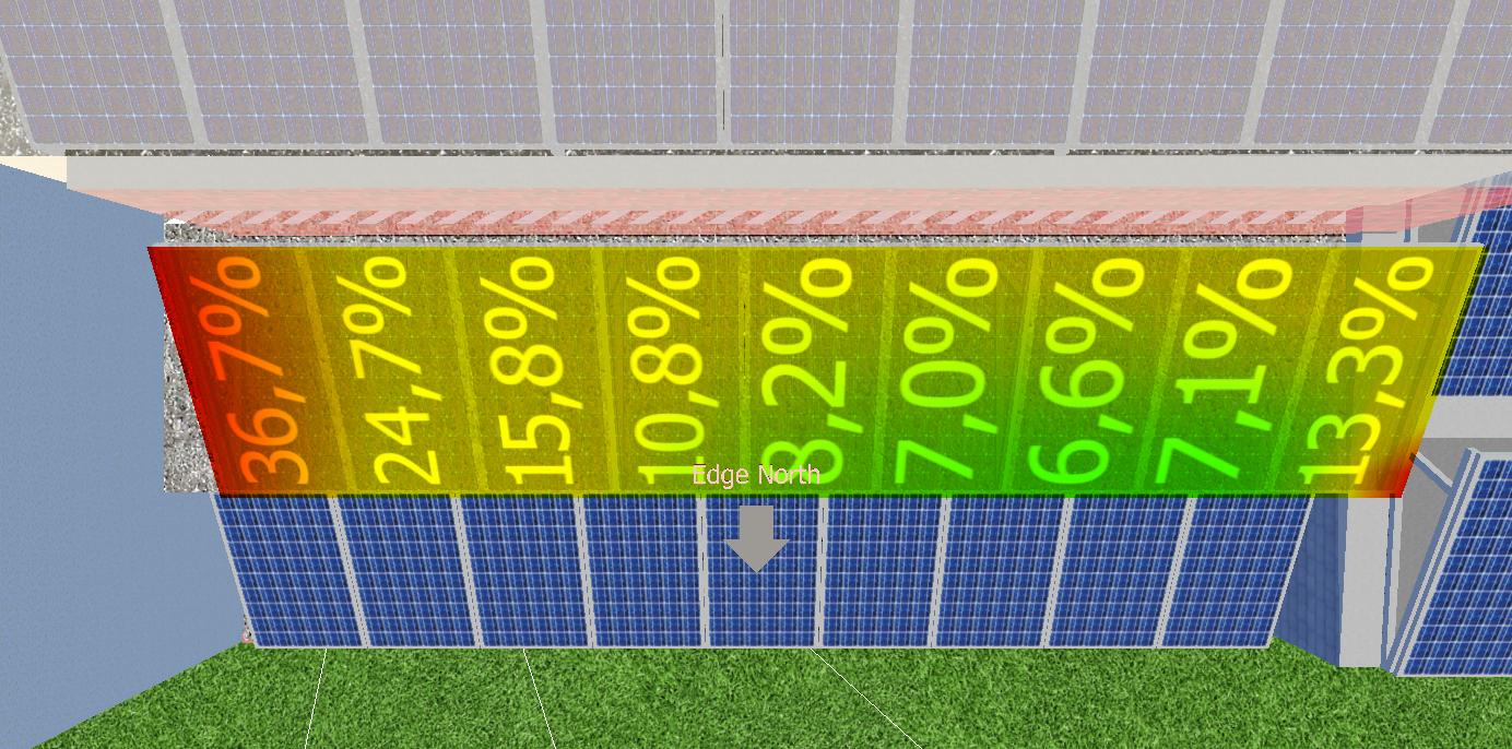 O primeiro resultado são informações em cores, indicando onde há mais sombra, e em percentual, informando para cada módulo, quanto ele perde ao longo do ano. Neste passo de modelagem 3D são indicadores, quais áreas devem ser evitadas.